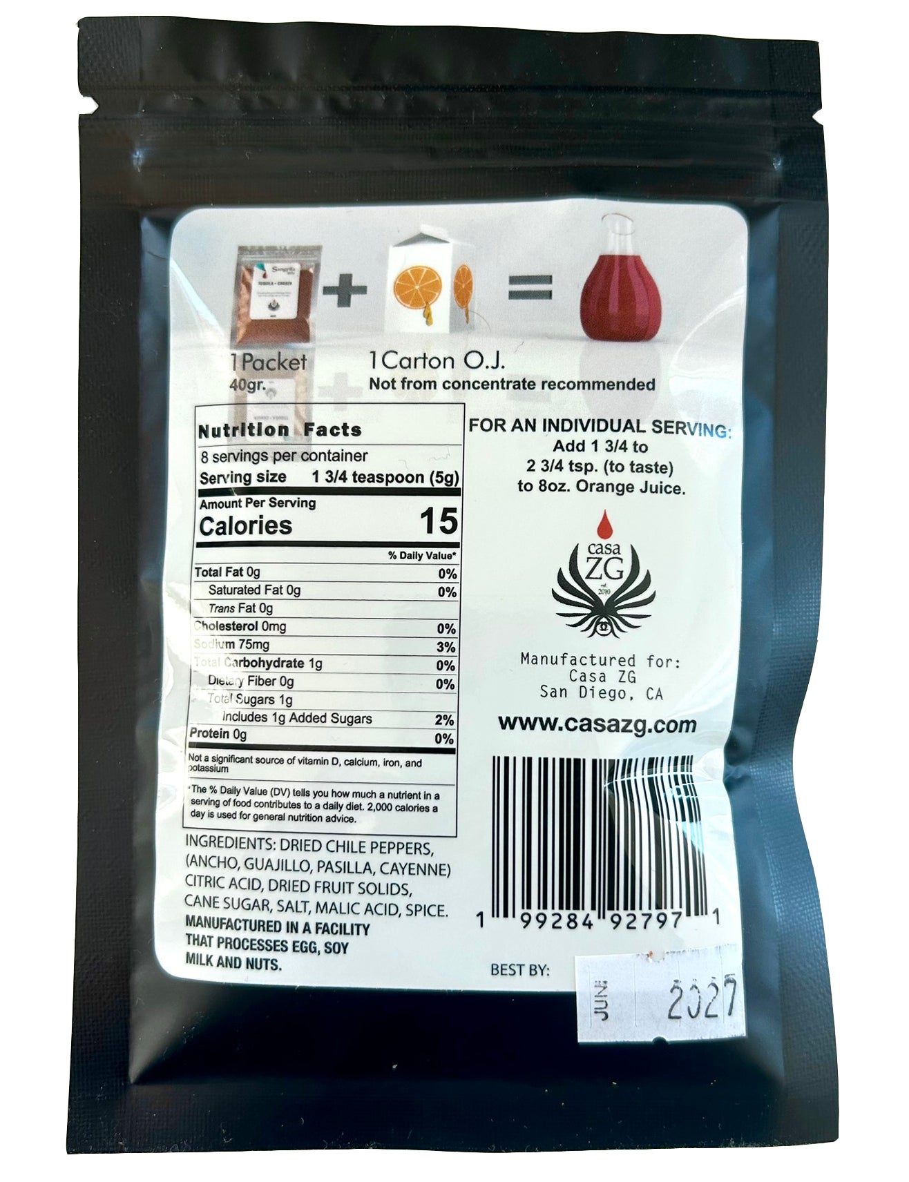 A single pack of mix consists of 40 grams of Sangrita Mix. Mixed with orange juice it makes up to 1/2 gallon of Sangrita, enough for 20 to 25 Sangrita Shots. Drink responsibly.